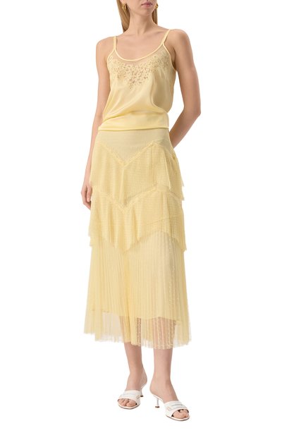 Топ Berwin с V-образным вырезом и тонкими бретелями отделан полупрозрачным тюлем с бахромой. Модель из шелкового атласа легко впишется в базовый гардероб.