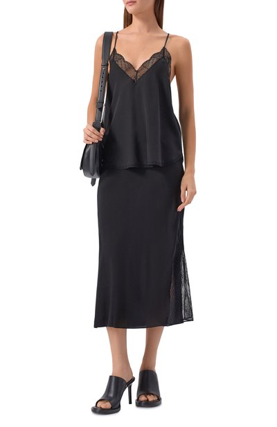 Для пошива топа Berwin с тонкими бретелями и V-образным вырезом использовали шелковый атлас. Края легкой модели свободного кроя отделали тюлем с бахромой.