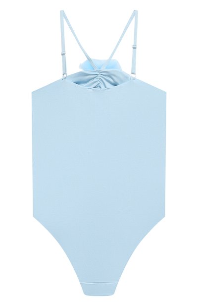 Палитру слитных купальников с вырезами на талии расширили светло-голубым оттенком. Для пошива использовали быстросохнущий материал, который не выгорает под воздействием солнца, а благодаря эластану в составе комфортно облегает фигуру. Мастера марки нанесли на ткань графичный тисненый узор, дополнив модель фестончатыми краями. Изделие застегивается с помощью плоской пряжки сзади, а добиться идеальной посадки позволяют длинные завязки.
