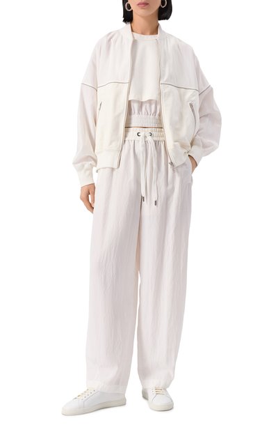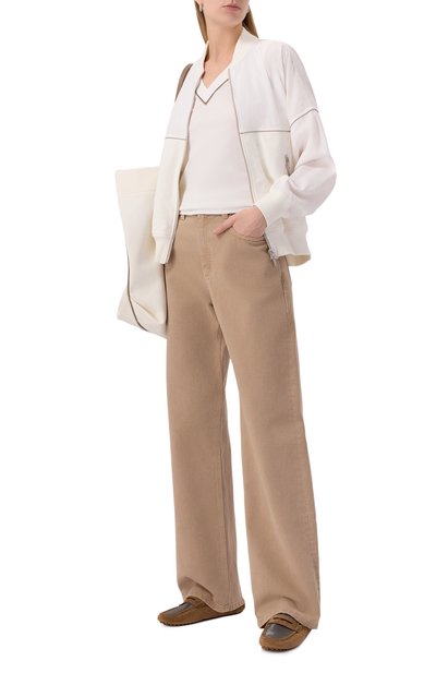 Белый топ из весенне-летней коллекции 2020 года – удачная инвестиция в базовый гардероб. Такая вещь гармонично дополнит и повседневный образ, и офисный ансамбль. Для создания модели с круглым вырезом использовали мягкий шелковый атлас. Изделие декорировали знаковыми для бренда, основанного Брунелло Кучинелли, цепочками мониль с гальваническим покрытием, которое долго не тускнеет.