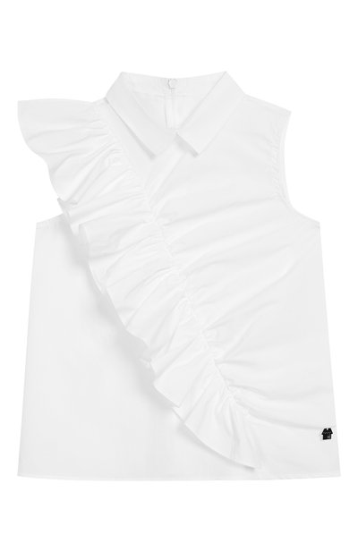Белая блуза с отложным воротником, без рукавов органично дополнит и джинсы, и легкую юбку. Для создания модели мастера использовали мягкий легкий хлопок поплин. Из такого же материала выполнена асимметричная оборка спереди (она добавит образу романтичности).