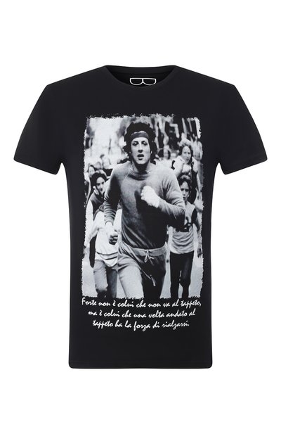 Визитной карточкой бренда стали футболки с крупными тематическими принтами. Например, на создание изображения на этой черной модели из весенне-летней коллекции дизайнеров вдохновил фильм «Рэмбо». Прямое изделие выполнено из мягкого хлопкового джерси, поэтому, в нем будет комфортно в течение дня.