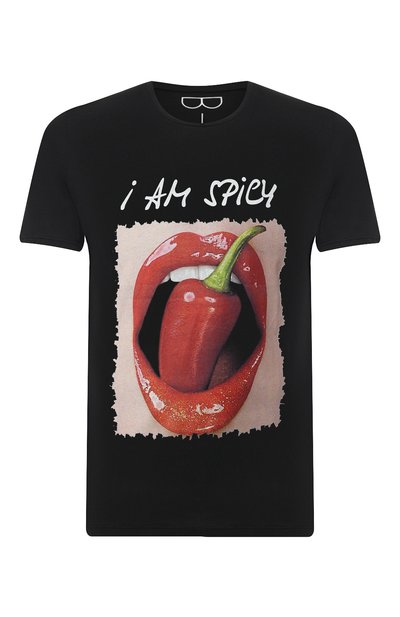 Черный задает тон этой футболке, но от этого она не выглядит бесцветной. За яркость здесь отвечает крупный красно-зеленый принт с надписью «I am spicy». Вещь с круглым вырезом сшита из мягкого прочного хлопка, который хорошо впитывает влагу. Изделие вошло в весенне-летнюю коллекцию.