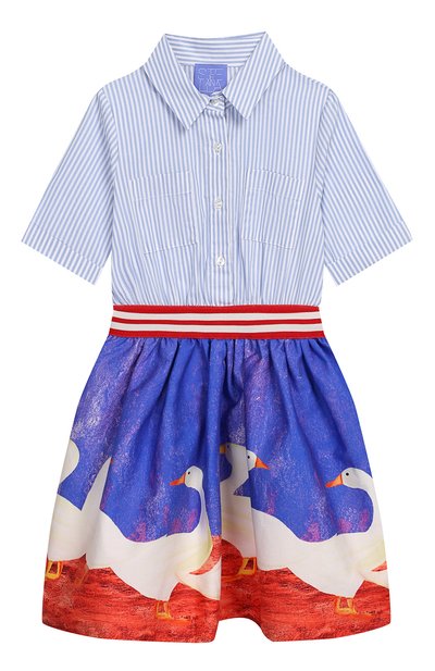 Это платье-рубашка словно сшито из двух разных моделей: белый строгий лиф в голубую полоску тут сочетается с ярким подолом, украшенным принтом в виде гусей. А связующим звеном между ними выступает красный эластичный пояс. Модель с короткими рукавами изготовлена из приятного на ощупь дышащего хлопка, в котором не будет жарко летним днем.