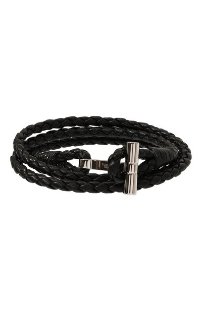 Черный браслет сплетен вручную из прочной мягкой кожи. Посадка аксессуара регулируется крупной пряжкой в виде буквы «Т» из золотистого полированного металла. Она покрыта гальваническим напылением, которое не потускнеет долгое время и защитит от коррозии и царапин.