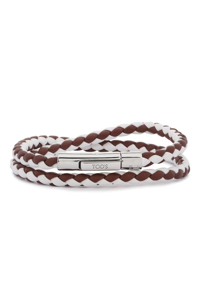 Мастера марки выполнили браслет из узких полос бежевой и коричневой кожи. Материал не боится царапин и повреждений, поэтому аксессуар долго не потеряет внешний вид. Изделие дополнили крупной застежкой с выгравированным логотипом бренда.