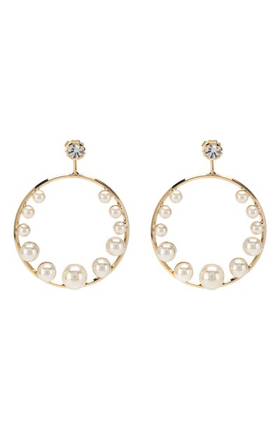 Эти серьги — аксессуар два-в-одном: крупную подвеску в виде кольца можно снять и носить украшение как пусеты, инкрустированные прозрачными кристаллами Swarovski. Для создания изделия Антон Хенис выбрал легкий ювелирный сплав с золотистым покрытием.
