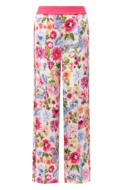 Красочный цветочный принт на этих брюках задает правильное настроение на весь сезон весна-лето 2019 года. Для создания модели мастера марки использовали плотную шелковистую вискозу. Изделие с узкими розовыми вставками по бокам, имитирующими лампасы, дополнено широким эластичным поясом. Наши стилисты советуют сочетать с однотонным жакетом, который поможет оттенить активный характер вещи.