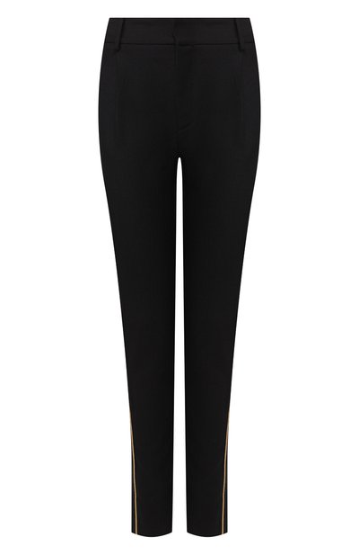 Эксперименты с дизайном помогли снизить градус формальности лаконичных черных брюк из весенне-летней коллекции. Тонкие золотистые лампасы адаптируют модель с комфортной завышенной посадкой для нарядного образа и визуально вытягивают силуэт. Мастера бренда, основанного Ивом Сен-Лораном, произвели вещь из мя гкой фактурной шерсти.