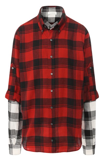 Клетчатый узор не обязательно отсылает к офисному дресс-коду. В случае с рубашкой из весенне-летней коллекции избежать дословного цитирования помог крой. Модель выглядит, будто поверх основной черно-белой вещи с длинными рукавами надели красную с подвернутыми. Различие по дчеркивают воротники: button down и мандарин. Для пошива изделия мастера марки использовали мягкий плотный хлопок.