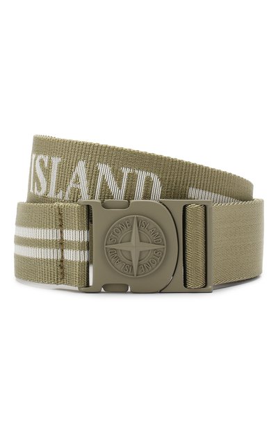 Ремень изготовили из фактурного материала цвета хаки, которому в марке дали название Sage. Благодаря плотному переплетению прочных нитей полиамида и полиэстера такая ткань хорошо держит и сохраняет форму. По всей длине аксессуара — две белые линии, которые сходятся к логотипу марки. Металлический фастекс декорировали рельефной розой ветров.