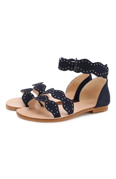 Темно-синие сандалии с широким низким каблуком и тонкой гибкой подошвой сшиты из мягкой замши. Высокий задник поддерживает пятку, предотвращая вывихи, а широкий ремешок с застежкой велькро надежно фиксирует обувь на ноге. Модель украшена миниатюрными позолоченными заклепками.