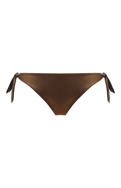 У плавок-бикини есть секрет: они словно выполнены из тонкой кожи с бронзовым металлизированным напы лением, которое особенно эффектно смотрится в движении. Для создания модели мастера использовали мягкую эластичную микрофибру, которая быстро сохнет. Посадка регулируется завязками по бокам.