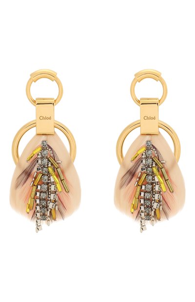 Массивные серьги можно носить в паре или создать асимметричный сет с пусетом. Для изготовления аксессуара мастера марки использовали гипоаллергенный ювелирный сплав. Модель украшена пушистыми перьями, мерцающим бисером и сверкающими кристаллами.