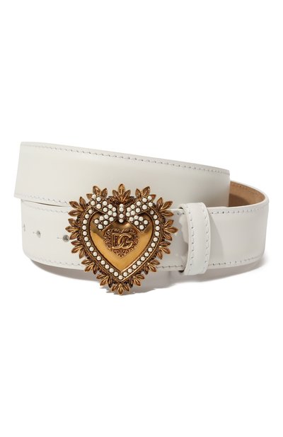 Скрывать белоснежный ремень под одеждой — нет смысла, ведь привычную пряжку у аксессуара заменили крупным золотистым сердцем Cuore Sacro. Через такой функциональный декор Доменико Дольче и Стефано Габбана отразили любовь к традициям: деталь выполнили вручную и инкрустировали жемчужинами. Для создания модели мастера марки использовали гладкую матовую кожу.