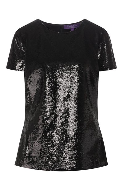 На показе весенне-летней коллекции Ральф Лорен сочетал черный топ с длинной юбкой и туфлями в тон, а наши стилисты предлагают составить образ total black с укороченными брюками и босоножками на шпильке. Стилизованную под футболку с круглым вырезом модель выполнили из эластичного джерси. Мерцающие пайетки, придающие вещи магию ночного неба, закрепили по особой многослойной технологии.