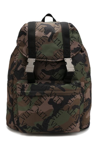 В рюкзаке цвета хаки Пьерпаоло Пиччоли объединил два мотива: камуфляжный узор и черный принт VLTN Grid. Мастера бренда, основанного Валентино Гаравани, сшили аксессуар из плотного текстиля. Изделие затягивается шнуром, продетым в люверсы, и закрыв ается клапаном с двумя ремнями и с застежками-фастекс (серебристые детали дополнены знаковыми для марки шипами-пирамидами). Модель вошла в весенне-летнюю коллекцию.