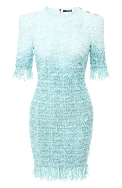 Платье из весенне-летней коллекции поможет снизить градус жары в теплый день: свежесть придаст мятный оттенок. Мастера марки, основанной Пьером Бальманом, выполнили модель из мягкого твида (особое плетение нитей создает эффект деграде). Благодаря нитям люрекса изделие слегка мерцает в лучах яркого света.