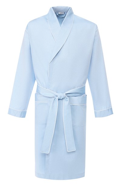 Небесно-голубой халат с шалевым воротником выполнили из тонкого шелковистого хлопка с геометрическим микроузором. Для создания материала используют специальные станки, поэтому он получается особенно приятным на ощупь и при этом прочным. Модель дополнили двумя накладными карманами и поясом.