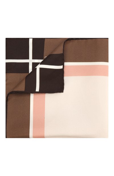 Для создания коричневого платка паше мастера марки использовали мягкий шелковый твил с характерным полуматовым блеском. Такой материал хорошо держит форму, поэтому аксессуар не требует особенного ухода. Модель с широким разноцветным кантом подшили вручную по технологии hand rolled (это заметно по слегка подворачивающимся краям).