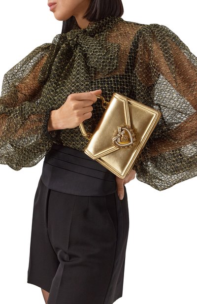 В сезоне весна-лето Доменико Дольче и Стефано Габбана добавили голубой сумке Devotion блеска. Модель выполнили из мягкой зернистой кожи с металлизированным эффектом. Неизменным остался декор: замок Sacro cuore в виде объемного сердца с ажурным кантом, перламутровыми бусинами и выгравированной DG-монограммой в центре выковали в старинной технике итальянских ювелиров. Аксессуар с короткой ручкой дополнили съемным плечевым ремнем-цепочкой.