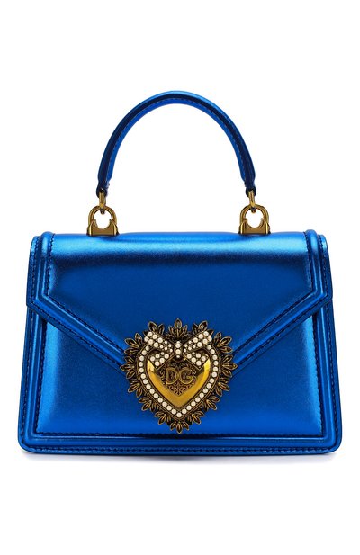 В весенне-летнюю коллекцию Доменико Дольче и Стефано Габбана расширили линию сумок Devotion, включив в нее эту небольшую модель. Ее сшили из гладкой металлизированной кожи наппа, окрашенной в насыщенный синий цвет. Неизменным осталась пряжка в виде сердца, которую вылили из сплава бронзы и латуни и инкрустировали перламутровыми жемчужинами вручную. Такой аксессуар справиться с ролью первой скрипки в любом образе.