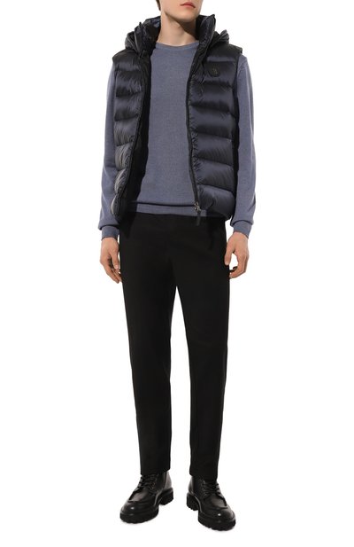 Голубой джемпер с круглым вырезом выполнили из тонкой премиальной шерсти мериноса, окрашенной в технике холодного нанесения пигментов. Модель из такого шелковистого, тщательно очищенного от сора и коротких волосков материала настолько легкая и приятная на ощупь, что ее комфортно носить на голое тело.
