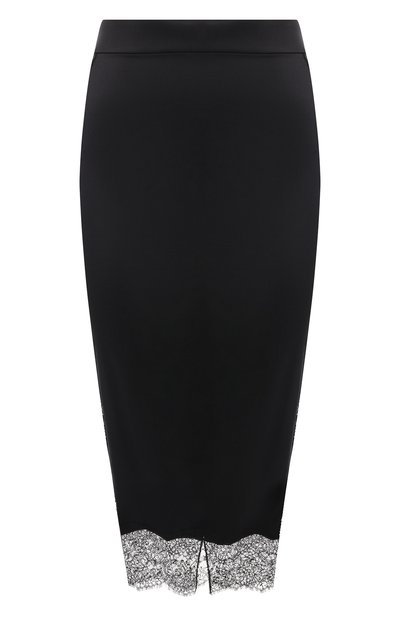 Том Форд сделал одной из ключевых вещей весенне-летней коллекции, на создание которой его вдохновил Берлин начала XX века, юбку-карандаш с кружевной отделкой. Одной из них стала эта черная модель из мягкого шелкового атласа. Вставки из полупрозрачной тончайшей шантильи с фестонами разместили по бокам и снизу, по краю. На показе изделие сочетали с топом и пальто в тон, кремовыми платком, туфлями и сумкой.