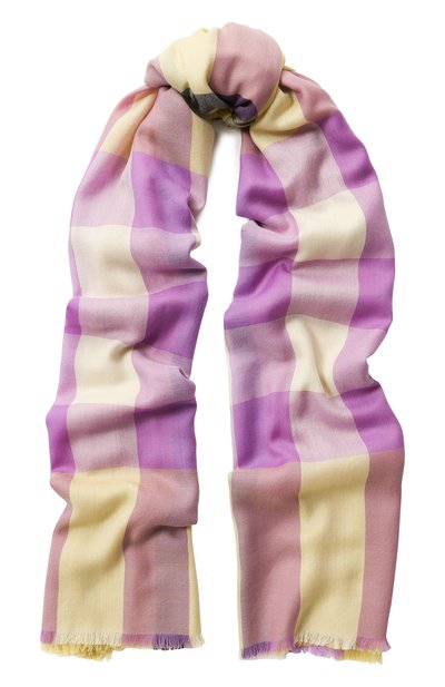 Аксессуар можно сделать акцентом в образе, выбрав яркий цвет. Например, этот шарф в крупную клетку лимонного и фиалкового оттенков. Для создания изделия мастера бренда использовали особенно легкий кашемир (чтобы придать материалу блеск и мягкость, его вычесывают вручную по старинной технологии).