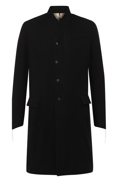 Черное пальто не выглядит строго. Расслабленности изделию с воротником-стойкой и двумя боковыми карманами добавляют нарочито не срезанные длинные нити. Для создания модели мастера использовали мягкий фактурный жаккард на основе прочного льна и хорошо пропускающего воздух хлопка. Заданное вещью настроение поддержат футболка и джинсы с разрывами и потертостями.