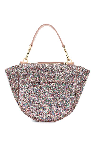 В весенне-летнюю коллекцию Эльза Вандлер включила небольшую сумкой Hortensia. Аксессуар в форме трапеции сшит из мягкой прочной кожи, покрытой сверкающим глиттером, который переливается всеми цветами радуги. Задняя панель выполн ена в приглушенно-розовом цвете. Ручку и плечевой ремень можно снять.