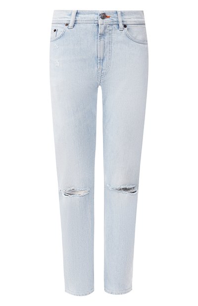 Светло-голубые джинсы из коллекции сезона весна-лето — базовый вариант, который подходит и к розовому свитшоту, и к белой футболке. Мастера марки выполнили модель с декоративными потертостями из плотного хлопка. Добавление в состав материала волокон эластана обеспечивает комфортную посадку по фигуре.