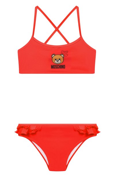 Мастера марки сшили раздельный купальник из эластичного полиэстера цвета спелой клубники. Материал не выгорает на солнце, не линяет и не блекнет под воздействием соленой и хлорированной воды, поэтому изделие долго будет выглядеть как новое. Бра декорировали знаковым для вещей бренда мотивом Teddy Bear, плавки — дву хъярусными оборками и надписью в виде логотипа.