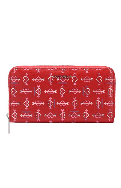 Графичное изображения белых и розовых сердец со стрелами украшает яркий красный кошелек, застегивающийся на круговую молнию. Декор поддерживает серебристая накладка в виде логотипа бренда. Для изготовления аксессуара с 12 слотами для кредитных карт, шестью отделениями для купюр и монетным карманом дизайнеры марки выбрали прочную кожу с фактурным тиснением.