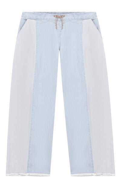 Укороченные светло-голубые джинсы с низкой посадкой сшиты из облегченного гладкого хлопка. По бокам — врезные карманы, сзади — накладной. На узком поясе — кулиска. Брючины отделаны внизу короткой густой бахромой.