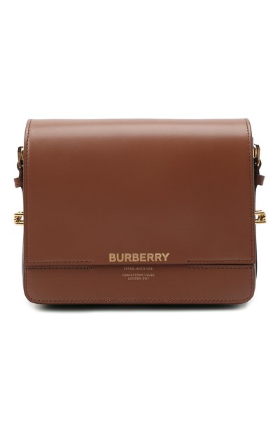 Коричневая сумка Grace из весенне-летней коллекции бренда, основанного Томасом Берберри, – модель 2-в-1: благодаря съемному ремню ее можно носить на плече или как клатч. Для создания аксессуара Рикардо Тиши выбрал гладкую мягкую опойковую кожу с прокрашенными вручную краями. На передней панели – золотистый принт Horseferry (его поддерживает тисненый логотип на клапане).