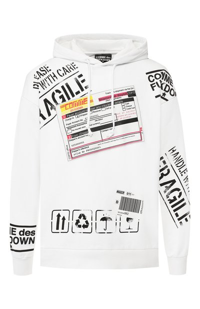 Для изготовления белого худи из коллекции сезона весна-лето дизайнеры выбрали мягкий хлопковый футер. Приятный на ощупь материал не электризуется и не пилингуется со временем. Модель с регулируемым капюшоном украшена крупными надписями в виде логотипа бренда и графичными принтами, стилизованными под бланк для почтовых отправлений и значки для маркировки грузов.