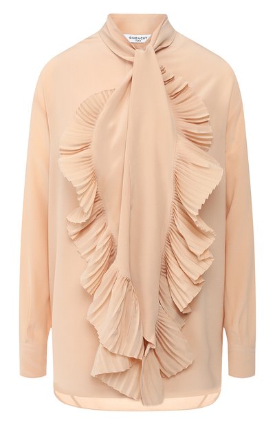 На создание весенне-летней коллекции Клэр Уэйт Келлер вдохновил стиль 1930-х. В дизайне светло-розовой блузы при помощи популярной в ту эпоху плиссировки обыграли воротник аскот. Для пошива модели с удлиненной спинкой мастера марки, основанной Юбером де Живанши, использовали легкий струящийся крепдешин. Наши стилисты предлагают носить изделие с черными брюками: от этого вещь только выиграет.