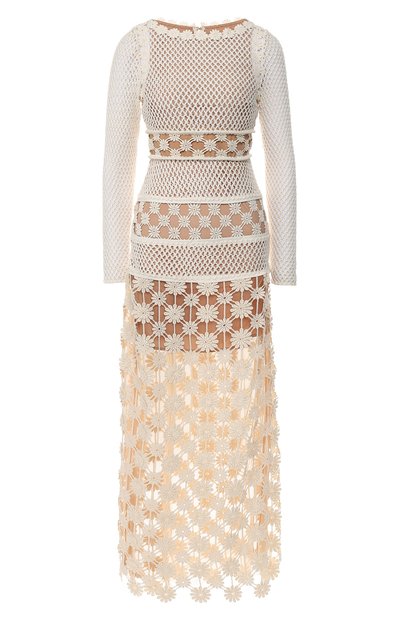 Приталенное белое платье с длинными рукавами и вырезом-лодочкой выполнено из ажурного мягкого кружева макраме с цветочным мотивом. Полупрозрачная модель с тонкой бежевой подкладкой застегивается сзади на молнию. Изделие вошло в коллекцию сезона весна-лето.