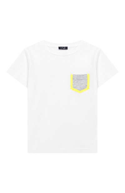 Белую футболку с круглым вырезом выполнили из легкого хлопкового трикотажа. Такой материал слегка тянется, поэтому вещь не сковывает движения. На передней панели – контрастный накладной карман, на плечевом шве – плоские кнопки.