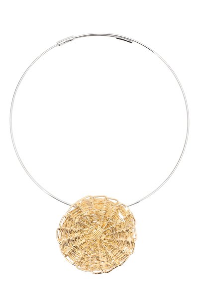 При создании колье Наташа Рамсей-Леви вдохновлялась средневековыми украшениями. Для изготовления аксессуара дизайнер выбрала прочный недрагоценный металл с двумя видами гальванического напыления: основание в виде жесткого кольца – серебристым, подвеска, напоминающее плетеный диск, – золотистым. Цилиндрическая миниатюрная застежка декорирована выгравированным логотипом бренда.