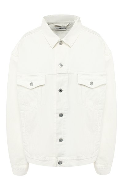 В сезоне весна-лето Демна Гвасалия искал разные варианты разнообразить белую джинсовую куртку. Например, здесь – объемный крой и крупный принт с логотипом бренда, основанного Кристобалем Баленсиагой.. Изделие выполнили из прочного приятного на ощупь хлопка.