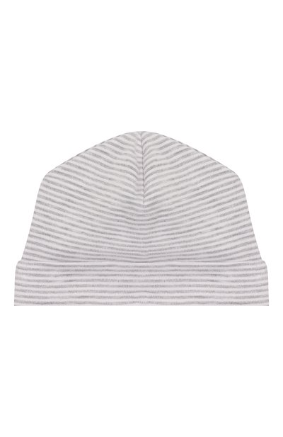 Серая шапка в полоску, с небольшим отворотом выполнена из двуслойного джерси на основе перуанского хлопка пима. Мягкий шелковистый материал не пилингуется и хорошо пропускает воздух, а сам аксессуар настолько легкий, что почти не чувствуется на голове.