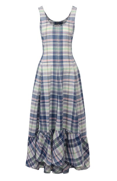 Для создания голубого платья без рукавов Ральф Лорен выбрал тонкий дышащий хлопок мадрас (клетчатый узор получают переплетением нитей, предварительно окрашенных в разные оттенки натуральными пигментами). На расклешенном подоле – широкая асимметричная оборка. Настроение поддержат сандалии и небольшая сумка.