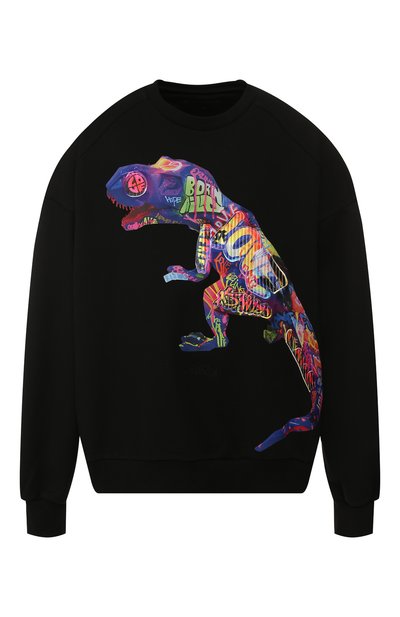 Джун Джи выбрал для пошива черного свитшота силуэта оверсайз плотный хлопок с махровой внутренней стороной, поэтому такая вещь обеспечит максимальный комфорт в прохладную погоду. А за счет пестрого рисунка в виде динозавра модель из весенне-летней коллекции будет солировать в повседневном комплекте. Наши стилисты предложили вариант с джинсами и кроссовками.