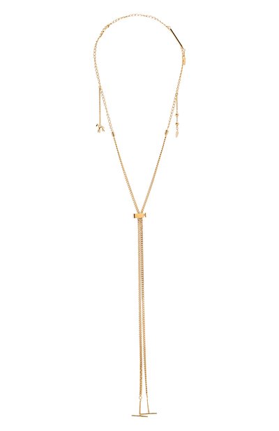 Мастера марки выполнили тонкую цепь для солнцезащитных очков из легкого полированного металла с напылением цвета желтого золота. Аксессуар панцирного плетения дополнен миниатюрными фигурными подвесками в тон.