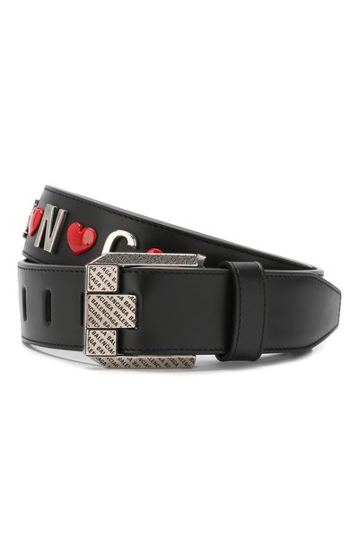 Черный ремень из матовой гладкой кожи — гимн тренду на логоманию. Демна Гвасалия украсил регулируемую модель крупной надписью в виде фамилии Кристобаля Баленсиаги, в которой буквы из серебристого металла чередуются с заклепками в виде ярко-красных сердец. Отделку поддерживает фактурный выгравированный паттерн из логотипа марки на массивной фигурой пряжке.