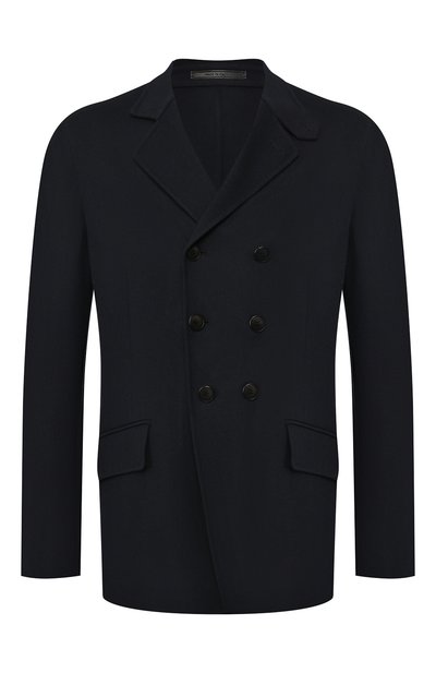 Темно-синий двубортный блейзер с врезными карманами сшит из гладкого мягкого кашемира. Отложной воротник легко превращается в стойку и фиксируется ремешком с пуговицей. Приталенный пиджак без подкладки идеально садится по фигуре и не утяжеляет силуэт.