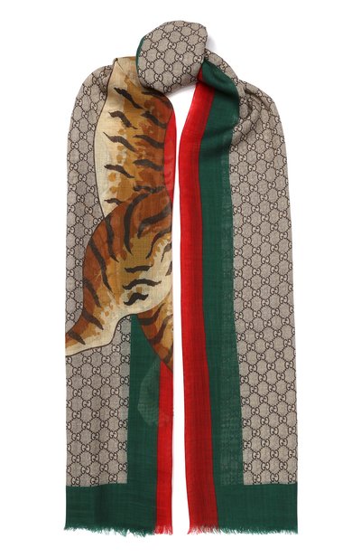 Тонкий палантин из легкой, почти полупрозрачной шерсти станет акцентной деталью в лаконичном образе. Аксессуар с короткой бахромой по краям украшен ромбовидным принтом GG Supreme, составленным из инициалов Гуччио Гуччи, и крупным изображением тигра (одного из символов марки). Широкий красно-зеленый кант — реверанс в сторону архивной ленты Web.
