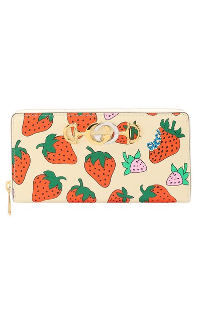 Кремовый кошелек сшили из фактурной кожи с ярким принтом в виде клубники. Модель состоит из 12 слотов для кредитных карт, трех отделений для банкнот и кармана на молнии. Переднюю панель украсили фигурной пряжкой, сложенной из знаковых для вещей марки, основанной Гуччио Гуччи, деталей: трензель объединили с GG-монограммой. Такой декор отличает изделия из линии Zumi, на создание которой вдохновила Зуми Росоу.